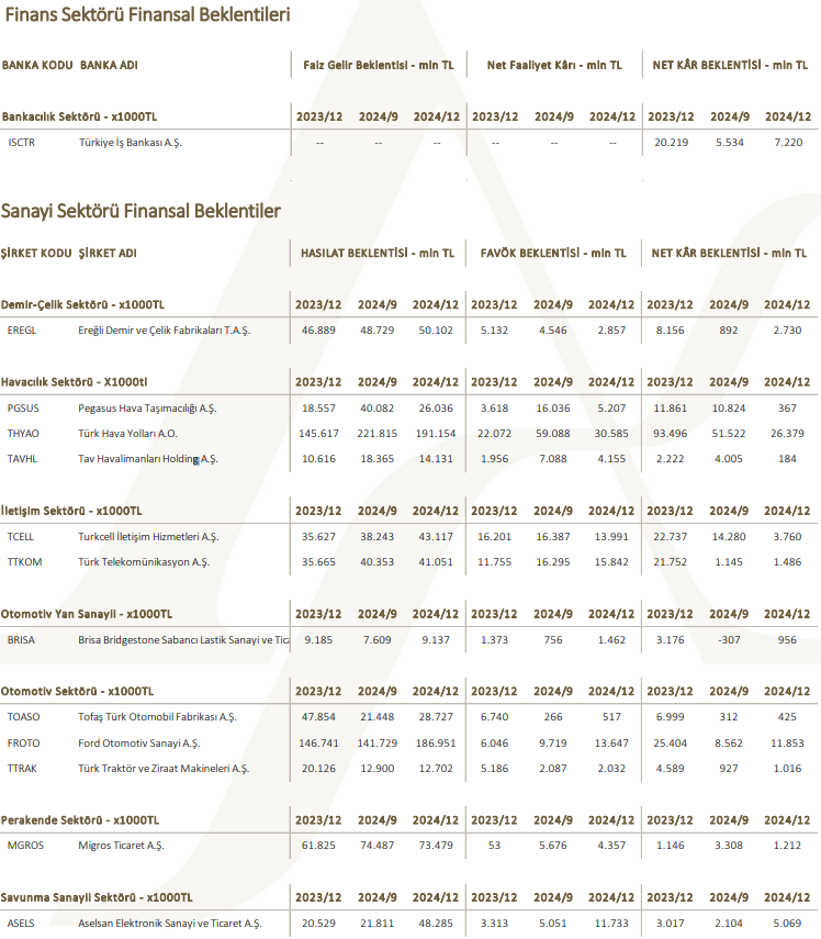 2024 4. Çeyrek Şirket Kâr Tahminleri / Ahlatcı Yatırım