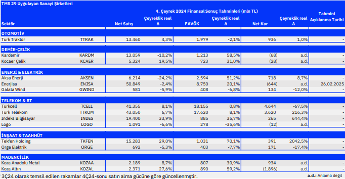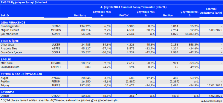 Sanayi şirketlerinde daralan talebin ve geçen seneki yüksek bazdan normalleşen marjların etkilerinin devam etmesini beklemekteyiz. Zayıf tarafta, Petkim’de tüm ürün gruplarında spread daralmasının derinleşmesi, dolayısıyla 3Ç24’e göre dahi daha güçsüz bir bilanço bekliyoruz. Satış hacminde güçlü bir görünüm beklememize karşın, düşen ürün fiyatlarına bağlı olarak Erdemir’de ton başı kârlılığın tarihsel seviyelere kıyasla oldukça zayıf olacağını öngörüyoruz. Yine de sigorta tazmin geliri net kârı destekleyebilir. Bunlara ek olarak Anadolu Efes ve Coca Cola İçecek şirketlerinin karlılıklarının, Coca Cola İçecek tarafında oluşan fiyat/karlılık baskısı nedeniyle tatminkar olmamasını beklemekteyiz. Güçlü tarafta, telekom sektöründe birçok sektörün aksine reel büyümenin sürmesini beklerken, Türk Telekom’un göreceli olarak öne çıkabileceğini düşünüyoruz. Endüstri genel olarak zayıf seyretmesine karşın; Kardemir’de ton başı kârlılığın son iki çeyreğe kıyasla önemli seviyede iyileşme göstereceğini düşünüyoruz. Zayıflık satış hacimlerine bağlı olarak; iyileşen kârlılığa karşın, muhafazakar bir yaklaşımla net zarar öngörmeye devam ediyoruz. Gıda sektöründe ise, 3Ç24’de karlılığını zayıf açıklayan Ülker’in ise daha yüksek satış hacmi ve fiyat ayarlamalarıyla beraber marjlarında gözle görülür toparlama beklemekteyiz. Son olarak da, İndeks Bilgisayar’ın ucuz elektronik malzemelerine olan yüksek talep dolayısıyla güçlü bir 4Ç24 geçirmiş olduğunu düşünüyoruz.