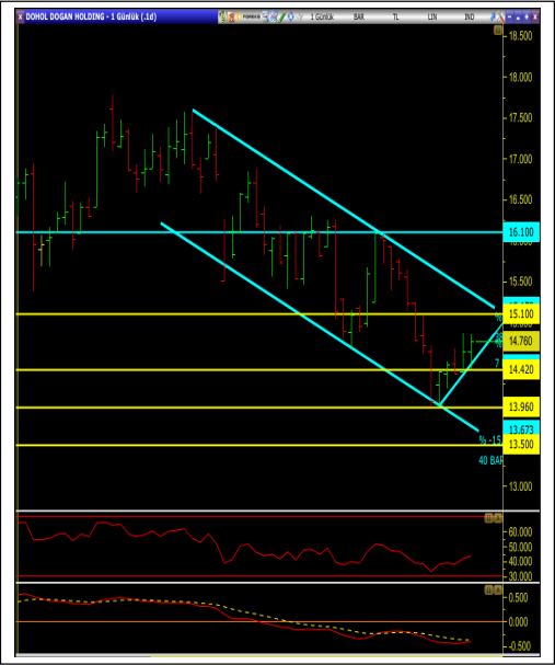 • Hisse oluşturduğu kısa vadeli trend eşliğinde hareketine devam eder ise 15.10 seviyesi ilk direnç olmak üzere sırasıyla; 15.60 ve 16.10 seviyeleri hedeflenebilir.