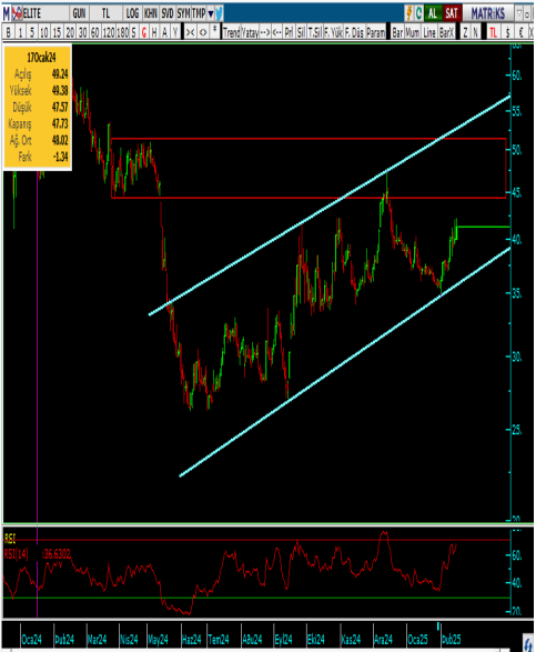 • Yukarıda 44.35 yatay direncini oluştururken 52.90 orta vadeli kanal direnci durumunda.