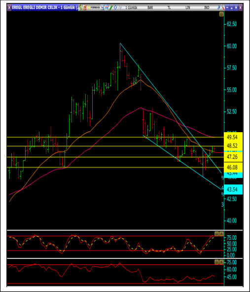 • Ancak düşen kanalın kırılmasından dolayı yaşanabilecek tepki ataklarında ise ilk olarak 48.52 seviyesinin takip edilmesini öneriyoruz. Daha önce önemli bir direnç olarak çalışmış bu seviyenin aşılmasının alıcılı seyre dönülmesini sağlayacağını düşünüyoruz. Bu seviyenin aşılması durumunda yeni pozisyonlar açılabilir ve 49.54 ve 52.85 seviyesi sıradaki dirençler olarak izlenebilir.