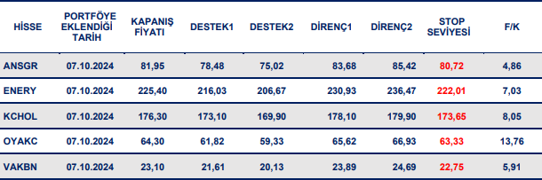 Kısa vadeli öneri listemize ANSGR, ENERY, KCHOL, OYAKC ve VAKBN pay senetlerini dahil ediyoruz.