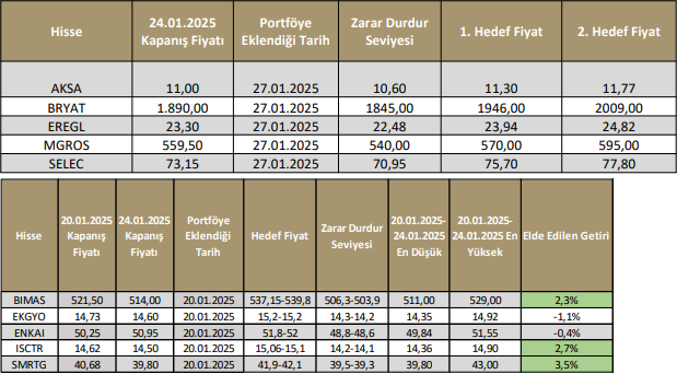27 – 31 Ocak haftası geçerli olan model portföyümüze AKSA, BRYAT, EREGL, MGROS ve SELEC hisselerini ekliyoruz. (*AKSA, EREGL ve SELEC katılım endeksine uygundur.)
