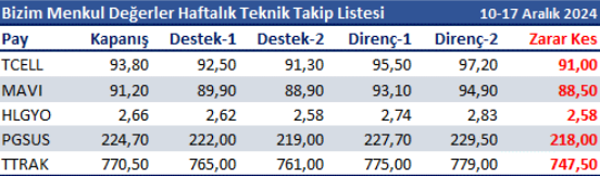 10-17 Aralık 2024 dönemi için teknik takip listemizde TCELL, MAVI, HLGYO, PGSUS ve TTRAK yer almaktadır.