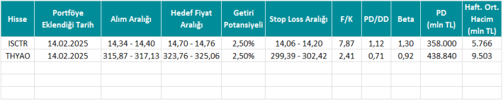 *Tablo yer alan fiyat sütunu verileri ile diğer veriler hisselerin portföye eklendiği tarihten önceki son işlem günü kapanış verileri üzerinden hesaplanmıştır.