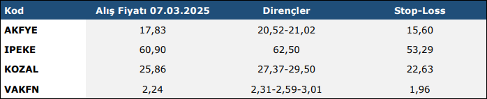 * Haftalık Teknik Takip Listelerinde (“Teknik Liste”) yer alan hisse senetleri, dirençler ve Stop-Loss seviyeleri teknik analiz kriterlerine göre seçilmiştir. Liste içerisinden bireysel hisse senedi seçimi yapılması beklentilerinize uygun sonuçlar doğurmayabilir.