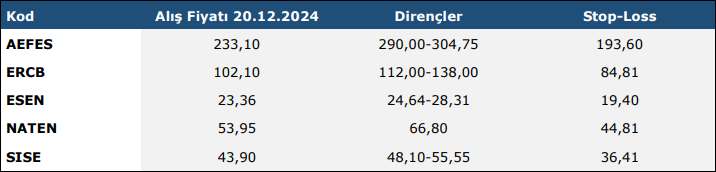 * Haftalık Teknik Takip Listelerinde (“Teknik Liste”) yer alan hisse senetleri, dirençler ve Stop-Loss seviyeleri teknik analiz kriterlerine göre seçilmiştir. Liste içerisinden bireysel hisse senedi seçimi yapılması beklentilerinize uygun sonuçlar doğurmayabilir.