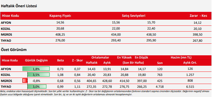 Kaynak: Ziraat Yatırım Haftalık Teknik Hisse Önerileri