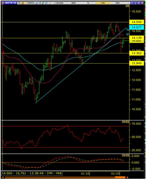 • Ocak ayı sonunda 14.95 seviyesine ulaşmış ardından art arda geri çekilmeyle birlikte trendin altına yerleşmiş.